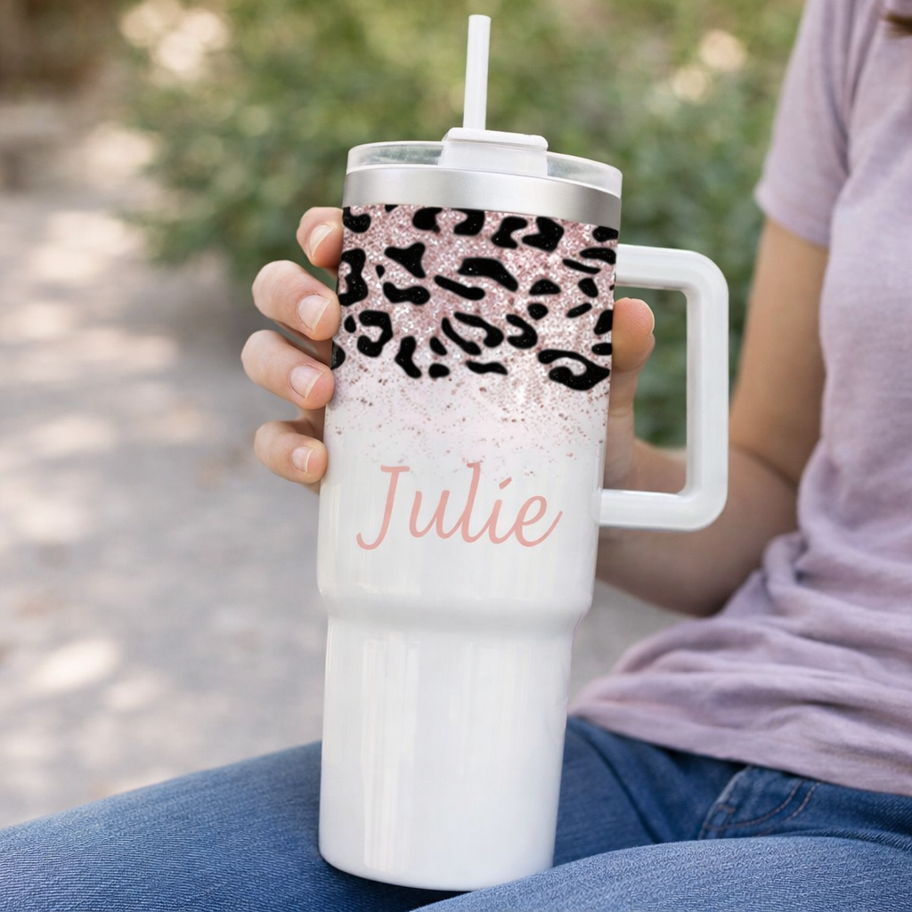 Add a bold and stylish touch to your everyday routine with this personalized leopard print tumbler. Featuring a chic black leopard pattern over a soft pink glitter fade, this custom cup is designed to stand out while showcasing your name in an elegant script.