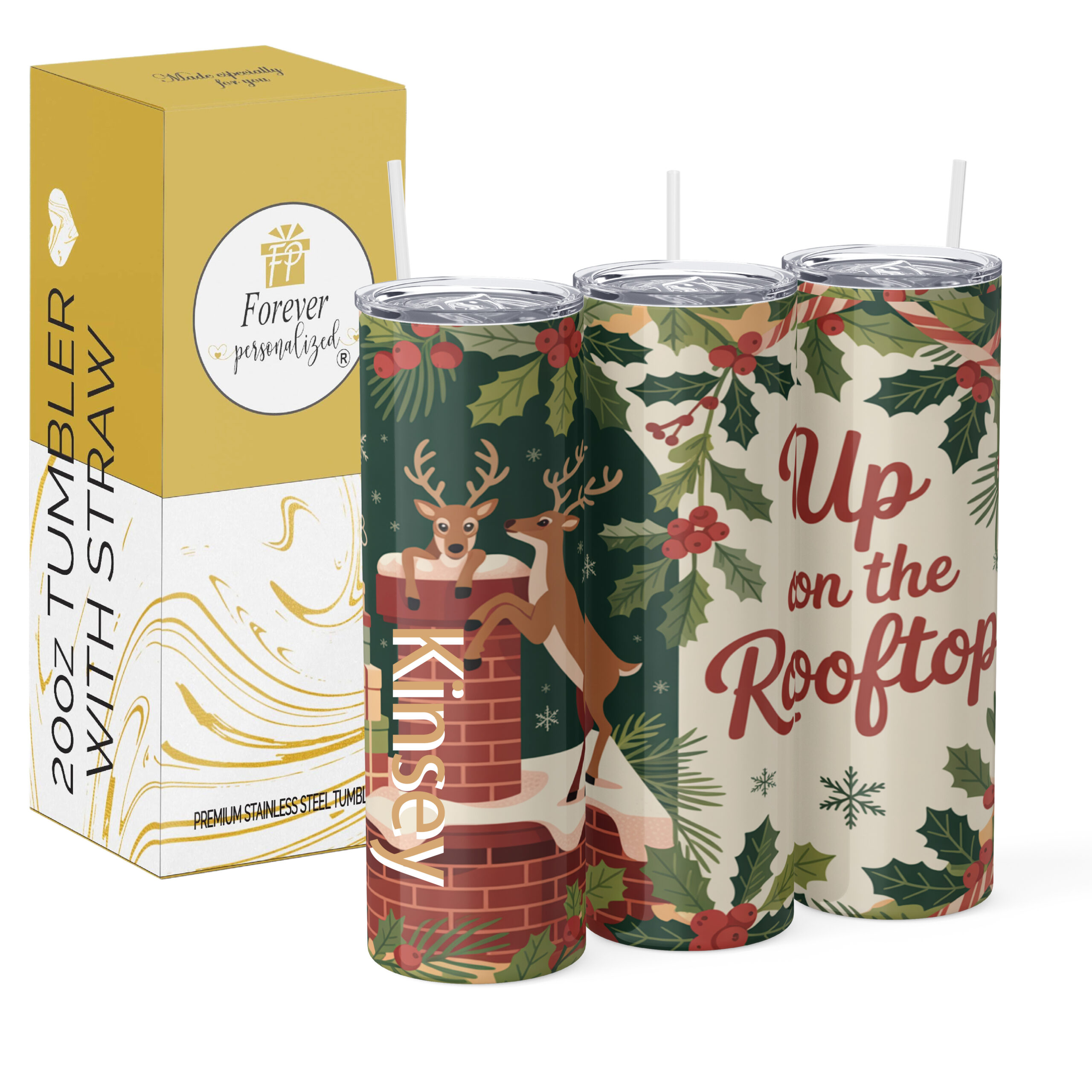 20oz tumblers made of premium stainless steel, personalized with a name, and includes lid& reusable straw. Available in multiple unique designs, perfect for anyone who loves the holidays with a touch of humor and style. Each Tumbler is made of premium stainless steel, keeping your drinks hot or cold for hours.