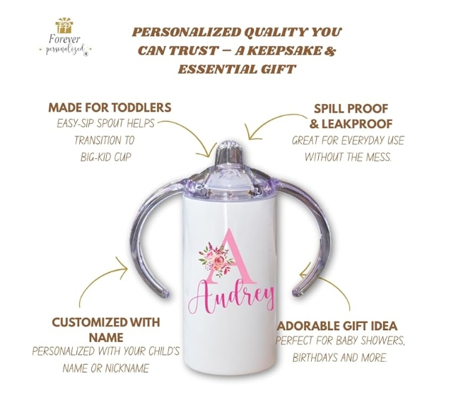 - 🌸 Beautiful Pink Floral Design – Features a delicate floral monogram letter and your baby girl’s custom name, making this sippy cup as stylish as it is special.