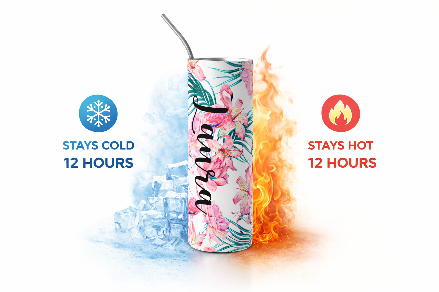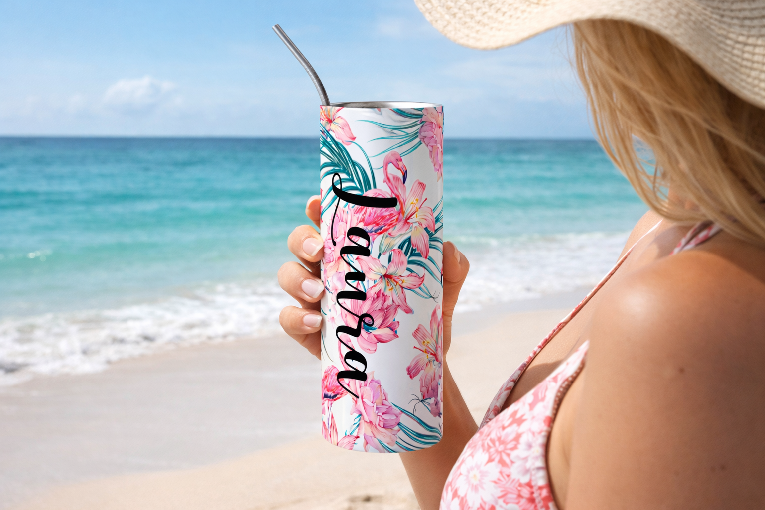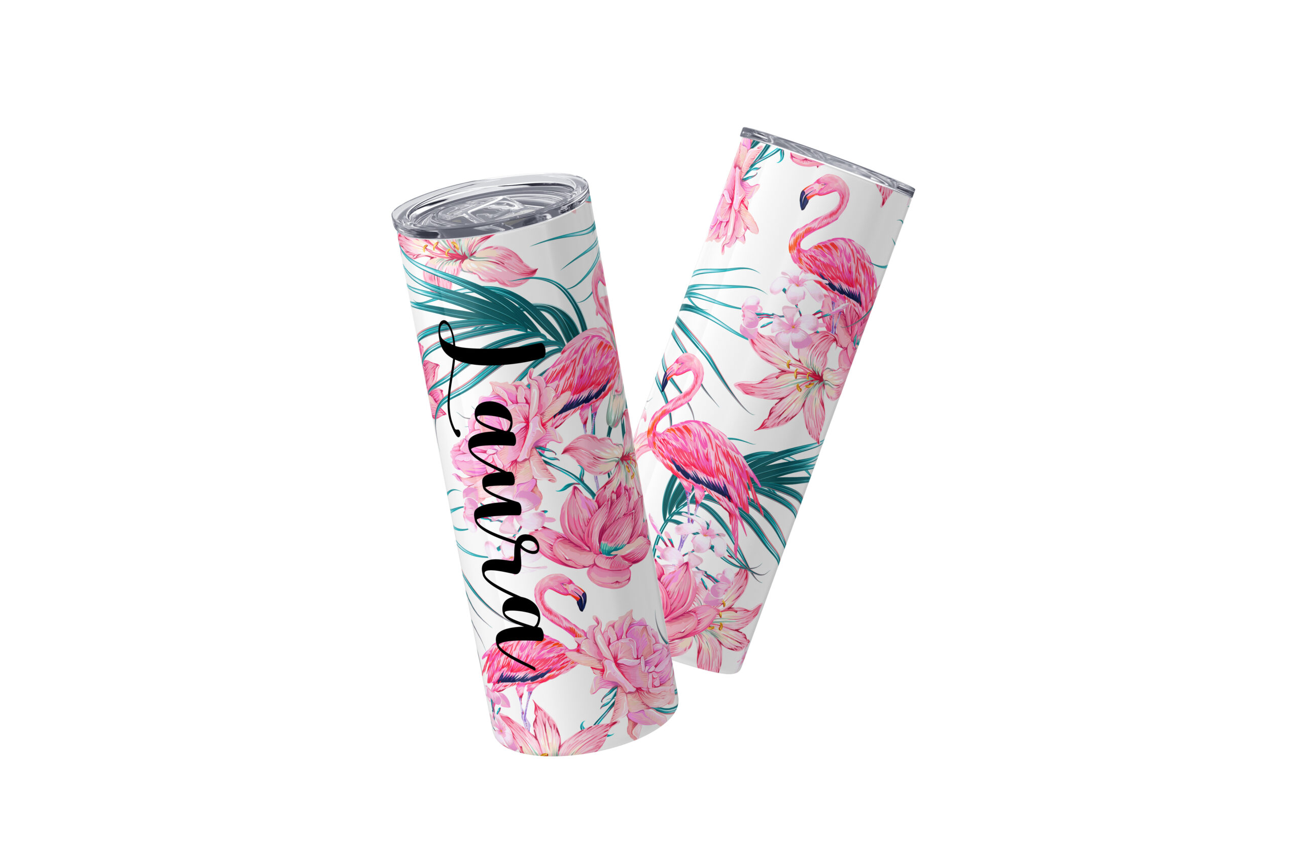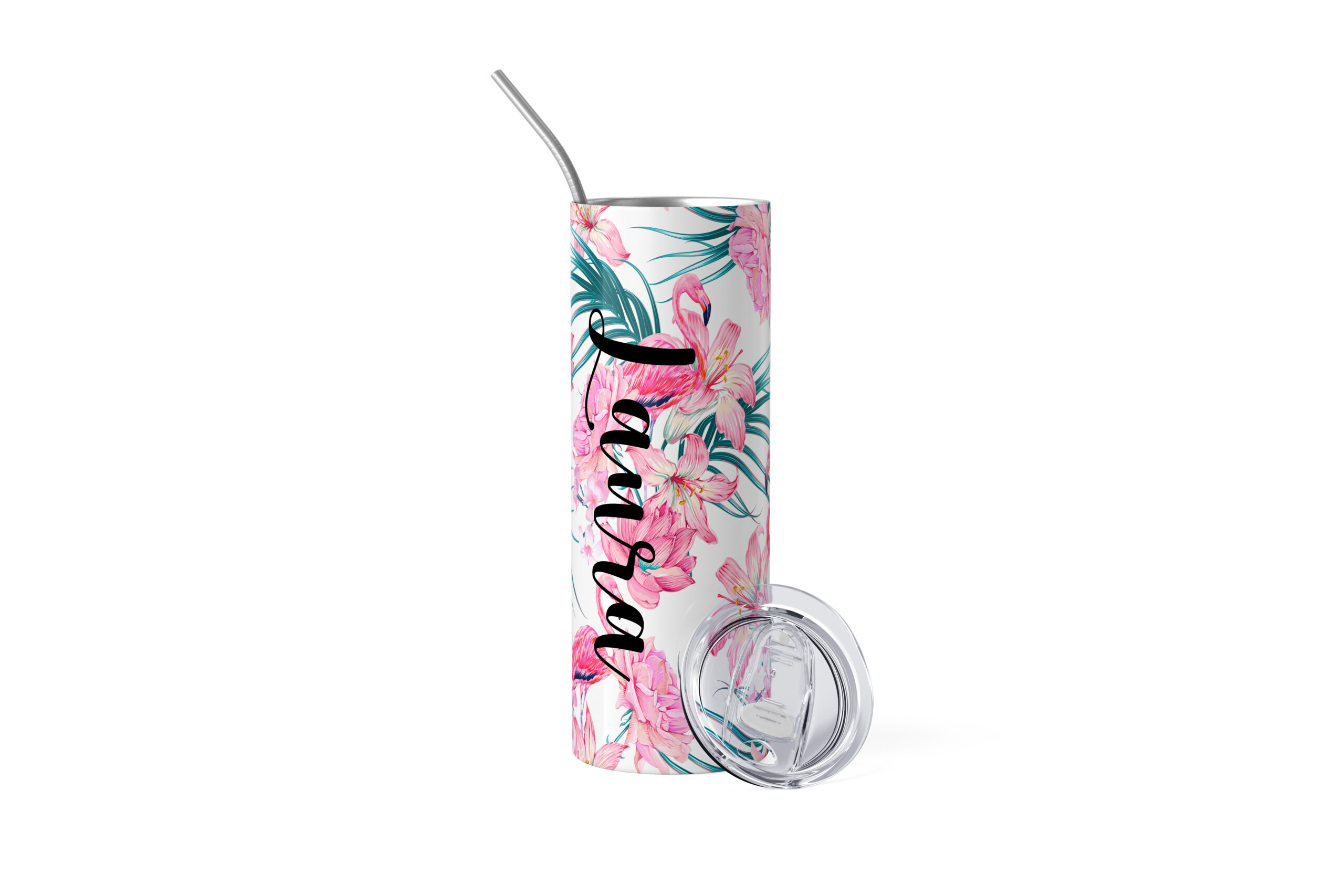 Bring a touch of vibrant, tropical style to everyday hydration with this beautifully designed personalized tumbler set. Featuring a lively floral pattern with soft pink blooms and lush green leaves, this sleek stainless steel tumbler is customized with a name in elegant script, making it a thoughtful and unique gift.